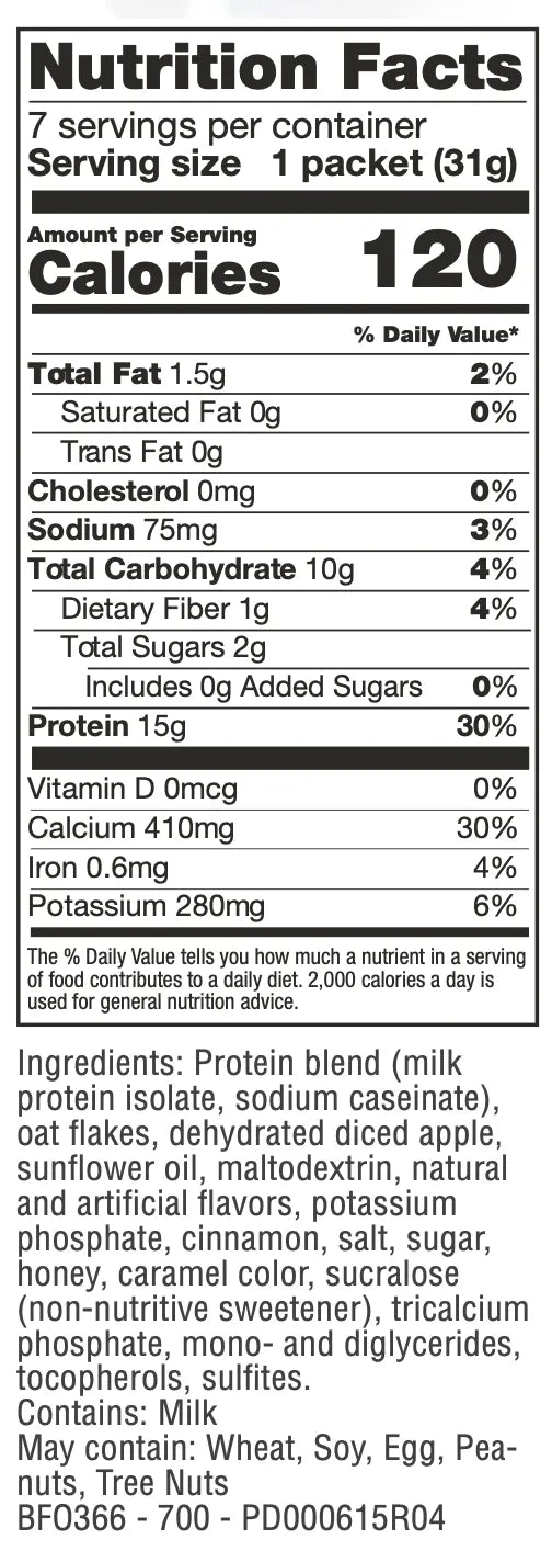 Discover Breakfast Bliss with Proti-Meal Apple Cinnamon Oatmeal Mix! We've carefully crafted this blend to infuse your mornings with the perfect balance of deliciousness and satisfaction. Indulge in the comforting flavors of real apple and aromatic cinnamon, enhanced with a touch of sweetness. With a generous 15g of protein in every serving, this protein-packed oatmeal will fuel your day and keep those hunger pangs at bay.